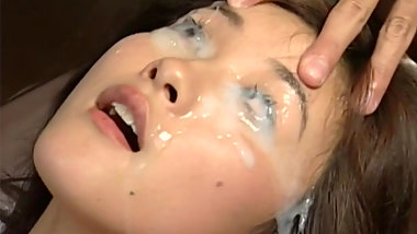 Desirous Japanese babe has her face soaked in nut butter at a raunchy bukkake action