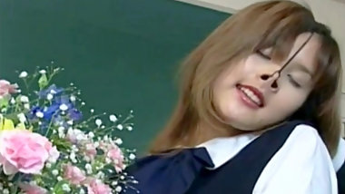 Asian college girl in uniform has her face streaked in schlong juice at a bukkake party