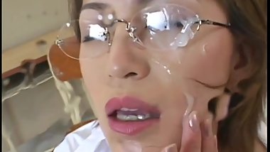 Jaapnese cutie gets nailed doggy style in the office and takes a load of cum on her hair